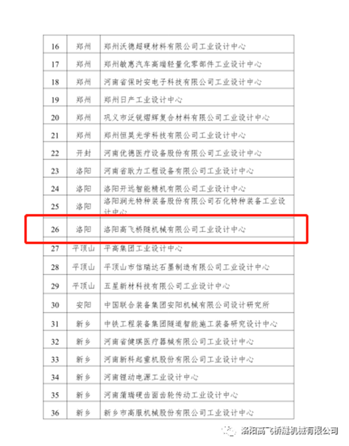 由河南省工業(yè)和信息化廳組織認(rèn)定的【第五批省級工業(yè)設(shè)計中心】名單公示,洛陽高飛橋隧機械有限公司工業(yè)設(shè)計中心榮列其中。原文如下:
