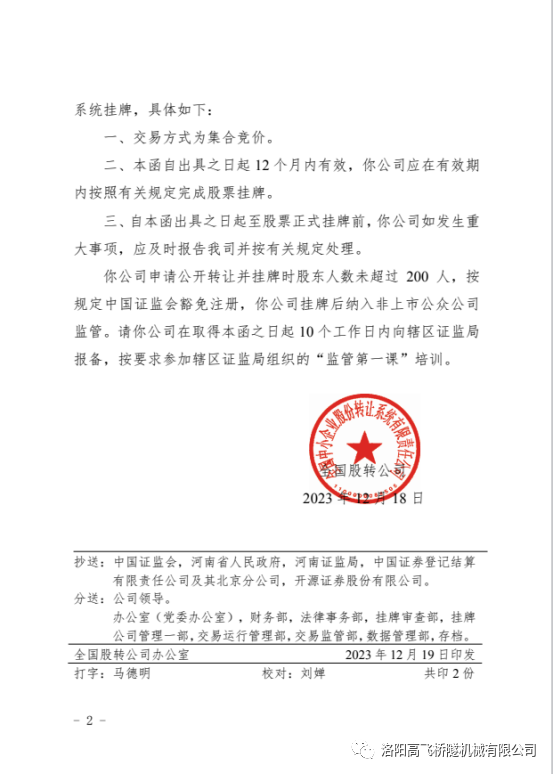 2023年 12月19 日,洛陽(yáng)高飛橋隧機(jī)械股份有限公司在全國(guó)中小企業(yè)股份轉(zhuǎn)讓系統(tǒng)掛牌成功,股票代碼:874169。